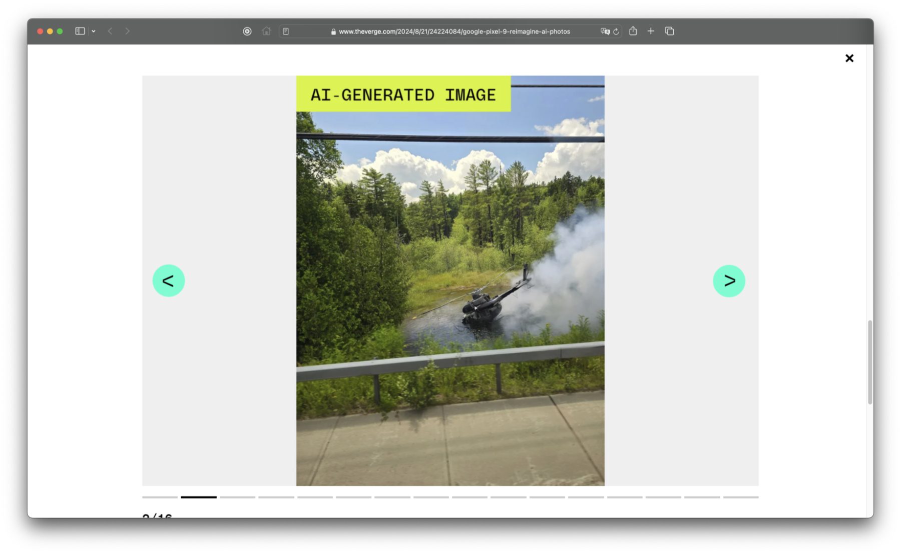 Bei The Verge werden Vorher-Nachher-Vergleiche zwischen originalen Fotos und mit Gemini auf dem Pixel-Phone bearbeitete Versionen derselben gezeigt. In ein Foto von Feuerwehrautos an einer Kreuzung wurde zum Beispiel eine rauchende Bombe eingesetzt. Weitere Beispiele zeigen einen abgestürzten KI-Hubschrauber in einem Fluss, eine Person mit per KI hinzugefügten Drogen, ein KI-generiertes großflächig klaffendes Schlagloch in einer Straße, ein KI-erzeugter Verkehrsunfall mit etwas, was nach einer abgedeckten Leiche aussieht, und dergleichen mehr. Man braucht nicht viel Fantasie, um sich die Auswirkungen solcher Bilder auf Facebook, X usw. vorzustellen.