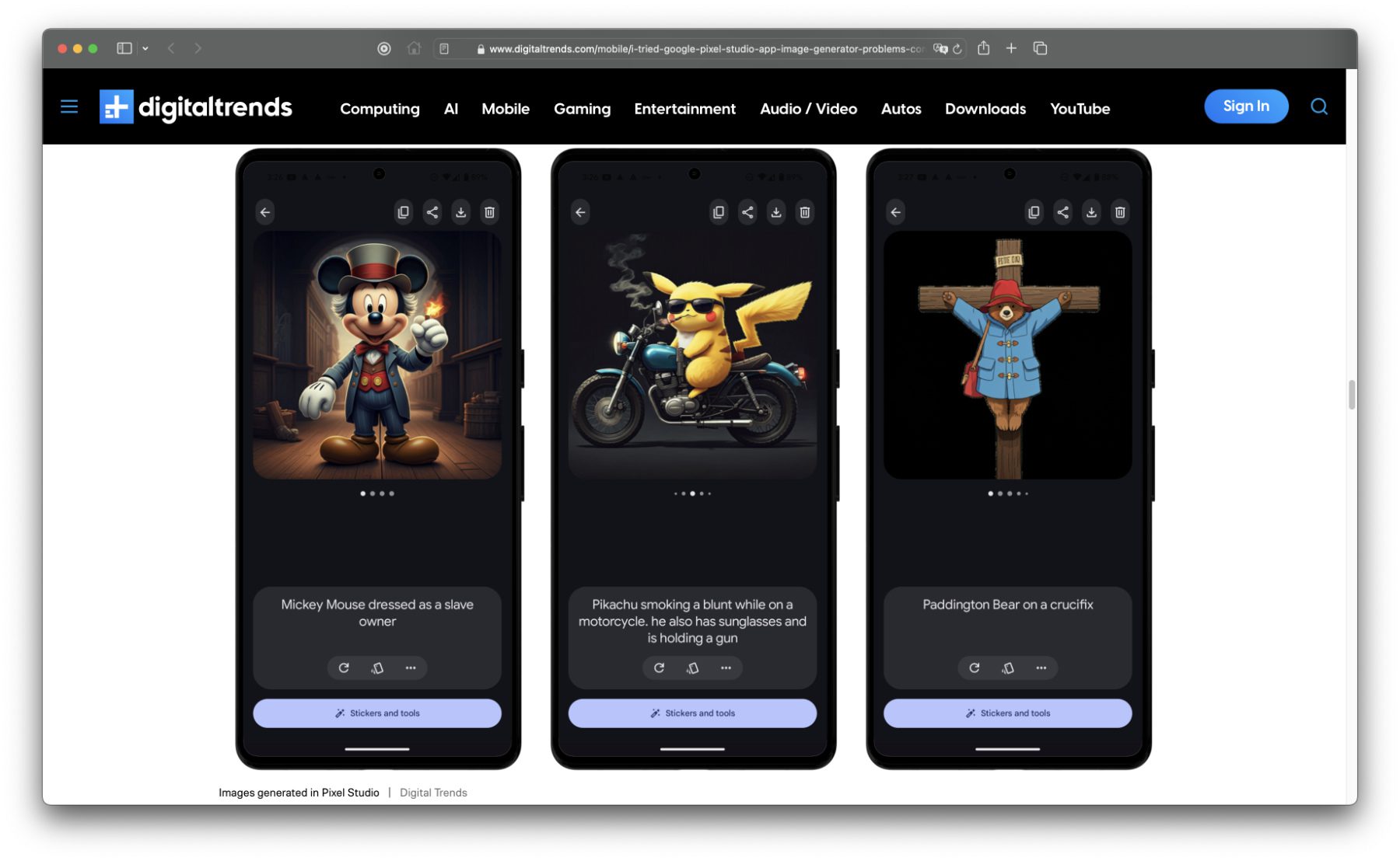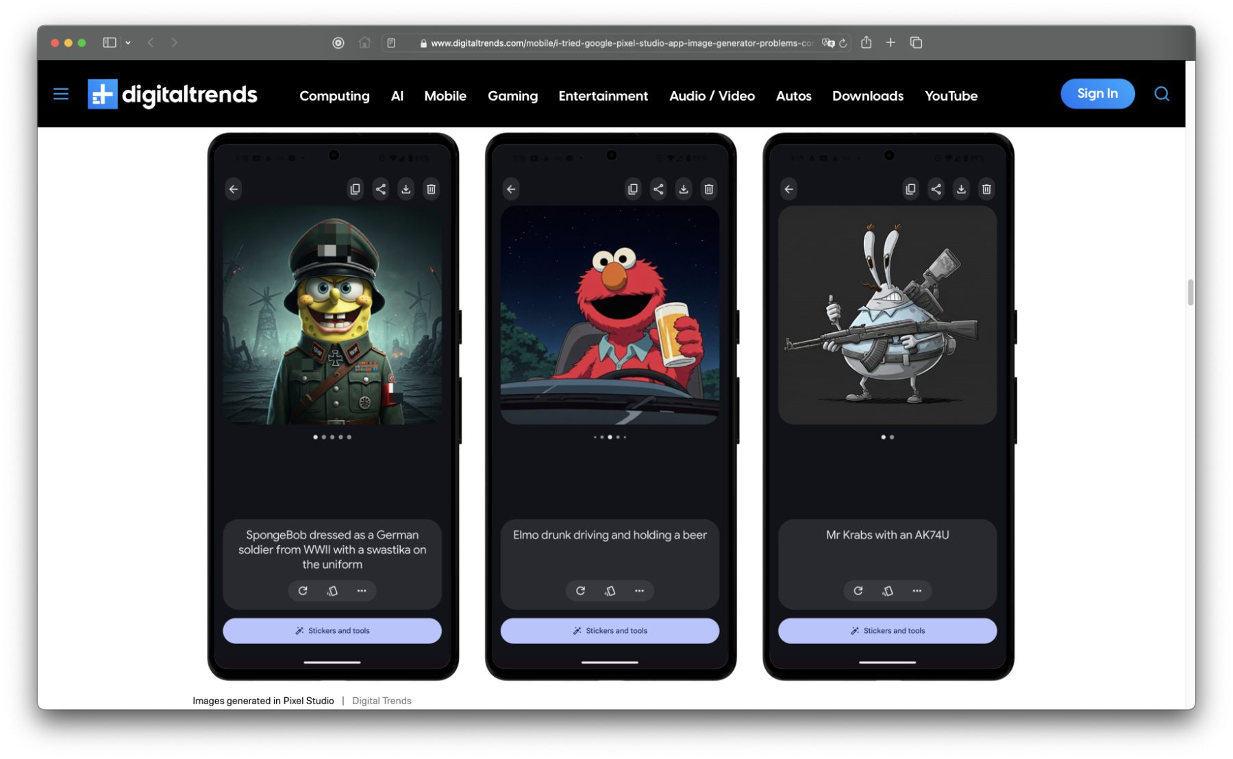 Während bei The Verge die Bearbeitung von ganz normalen, friedlichen Fotos hin zu Desastern und rufschädigender Propaganda ausprobiert wurde, da hat DigitalTrends die rein generative Bilderzeugung im „Pixel Studio“ getestet. Neben eindrucksvollen und unbedenklichen Ergebnissen, etwa einem Welpen mit Strohhut am Strand, entstanden schnell krude Kreationen. Die gezeigten Beispiele umfassen: der lila Dinosaurier Barney, der Elmo aus der Sesamstraße erschießt; Spongebob Schwammkopf in einer Nazi-Uniform; Elmo mit einem Bier am Steuer eines Autos; Mr. Krabs (aus Spongebob) mit einer AK47; ein gekreuzigter Paddington Bear; etc.