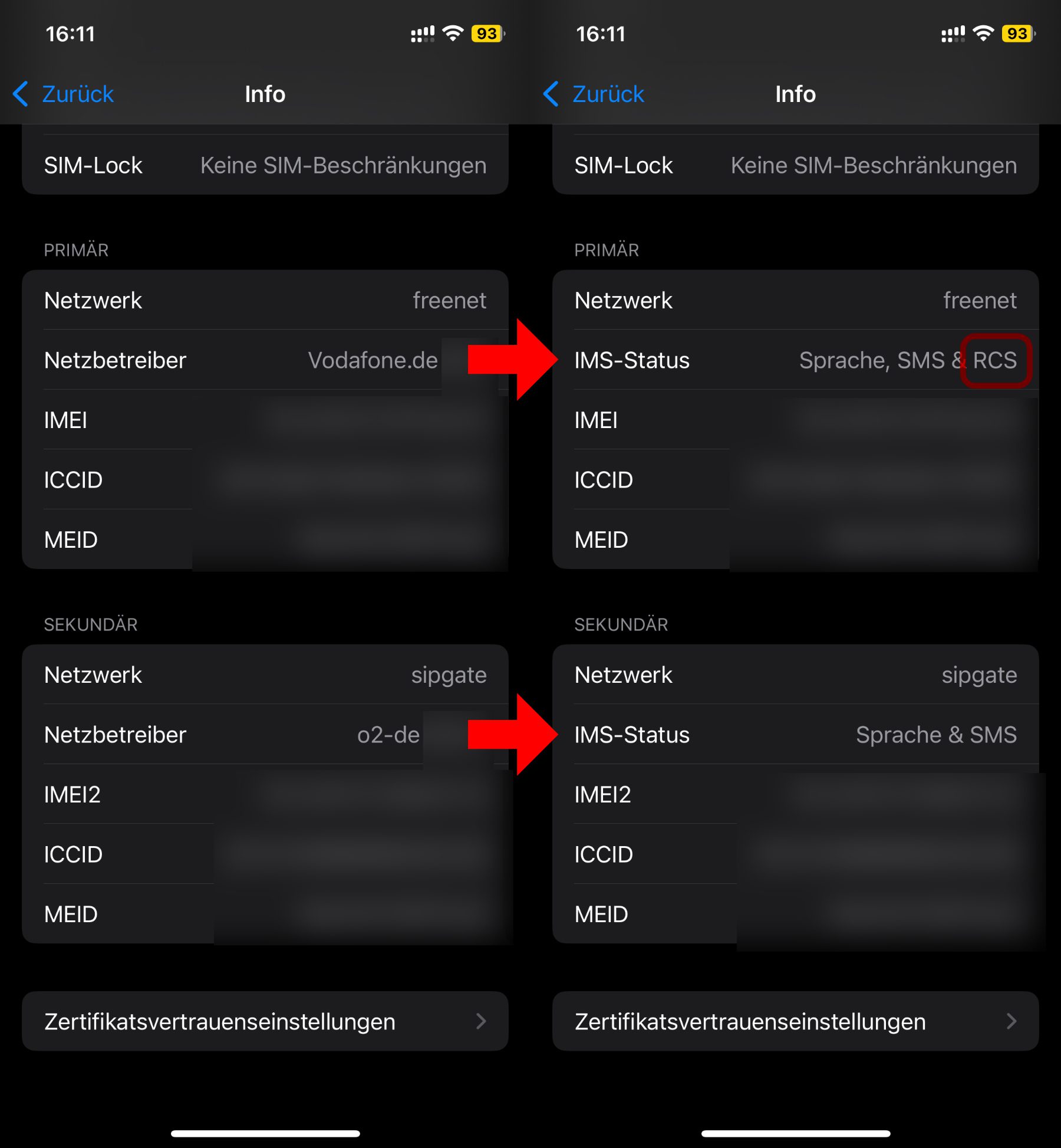 - Erscheint IMS-Status, sollte daneben „Sprache, SMS & RCS“ stehen