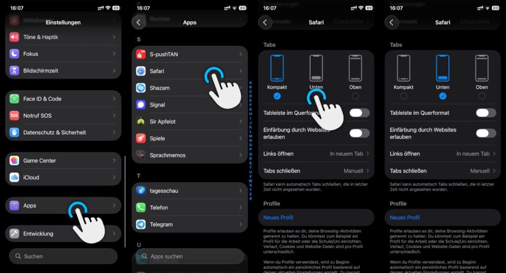 Safari-Layout im Vergleich: Kompakt, Unten und Oben (unter iOS 26)
