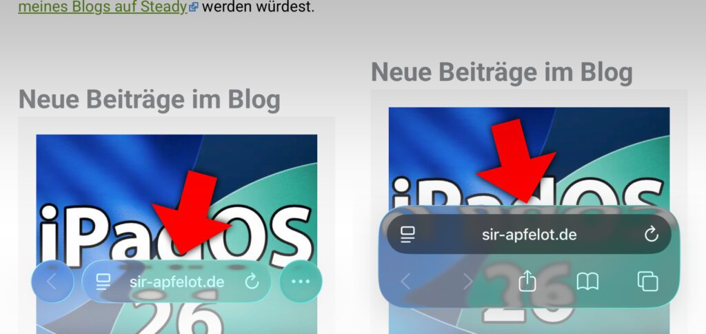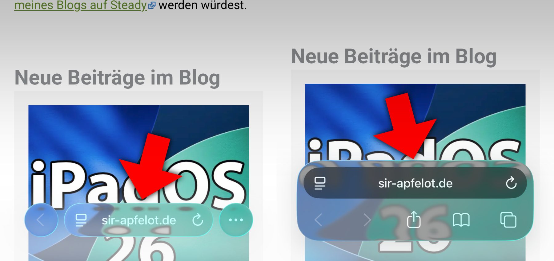 Unten bedeutet, dass statt des Menüs mit den weiteren Optionen selbige als eigenständige Buttons angezeigt werden – wie zuletzt unter iOS 18: Zurück, Vor, Teilen, Lesezeichen, Tab-Übersicht. Die Ansicht wird beim Scrollen zu unteren Seiteninhalten verkleinert.