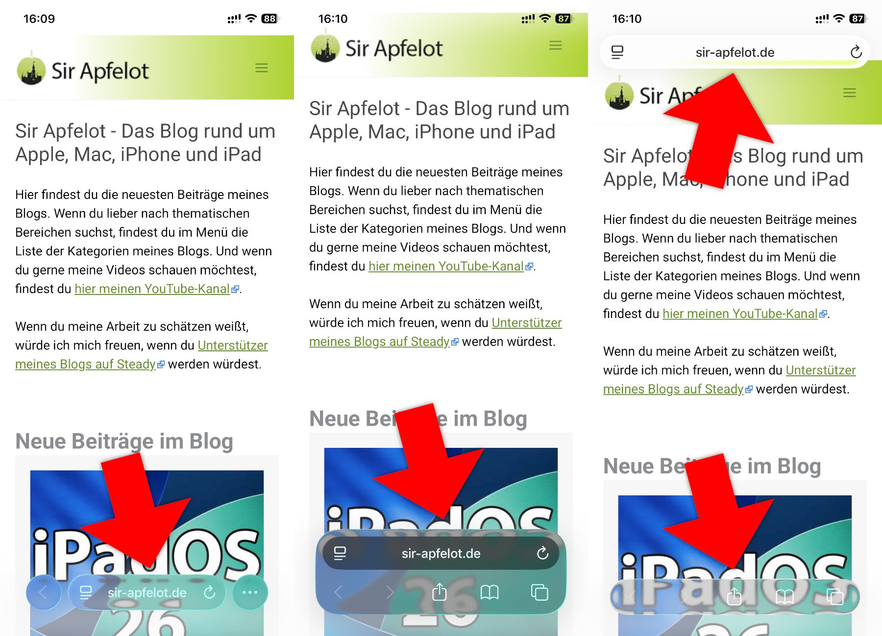 Safari-Layout im Vergleich: Kompakt, Unten und Oben (unter iOS 26)