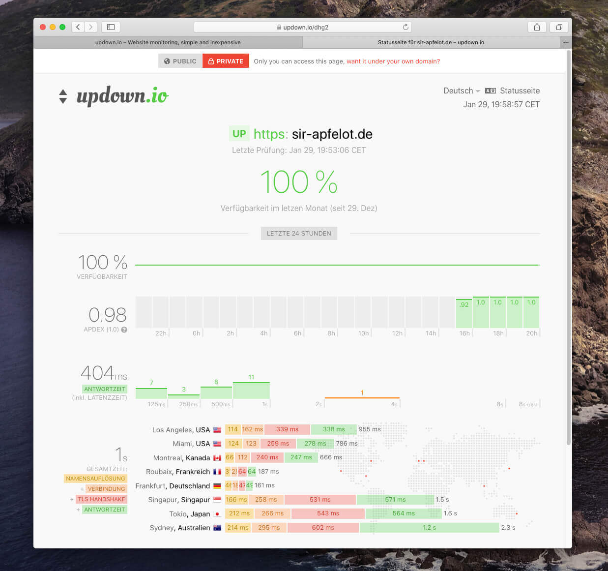 Vor einigen Monaten war ich auf der Suche nach einem Monitoring-Service, um mein Sir Apfelot Blog gegen Ausfall zu schützen oder um wenigstens eine kurze Information zu erhalten, wenn der eigene Blog down ist. Einige Provider bieten solch einen Service zwar an, aber meistens wird nur überprüft, ob der Webserver auf die Test-Anfrage eine Antwort schickt. Wenn das nicht der Fall ist, schlagen diese Systeme Alarm. Übertrieben gesagt ist dies so, als würde man bei einem Mensch schauen, ob er noch Puls hat. Das ist aber noch lange kein Indiz dafür, dass man sich auch mit ihm unterhalten kann. Ihr versteht, was ich meine. :D