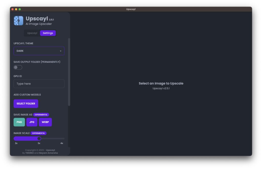 Ist das Programm einmal geöffnet, dann erschlägt es einen nicht mit zu vielen Optionen oder komplizierten Menüs. Es ist einfach gehalten und bietet nur zwei Tabs: „Upscayl“ für die Nutzung der Kernfunktion sowie der Auswahl der dafür nötigen Einstellungen. Und „Settings“ für Einstellungen, die das Programm und die Rahmenbedingungen der Verwendung betreffen.
