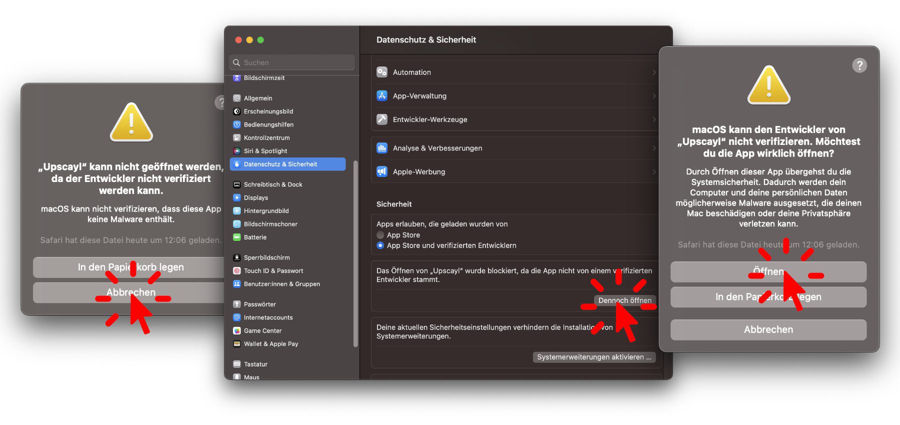 Beim ersten Öffnungsversucht könnte es aber passieren, dass euch der Mac-Gatekeeper darauf hinweist, dass Upscayl nicht geöffnet wird, „da der Entwickler nicht verifiziert werden kann“. Klickt in diesem Fall auf „Abbrechen“, öffnet die Systemeinstellungen, geht dort in den Bereich „Datenschutz & Sicherheit“ und klickt beim Hinweis auf die Upscayl-Blockierung auf den „Dennoch öffnen“-Button. Beim darauf folgenden Öffnungsversuch klickt ihr nochmal auf „Öffnen“ und dann kann es endlich losgehen.