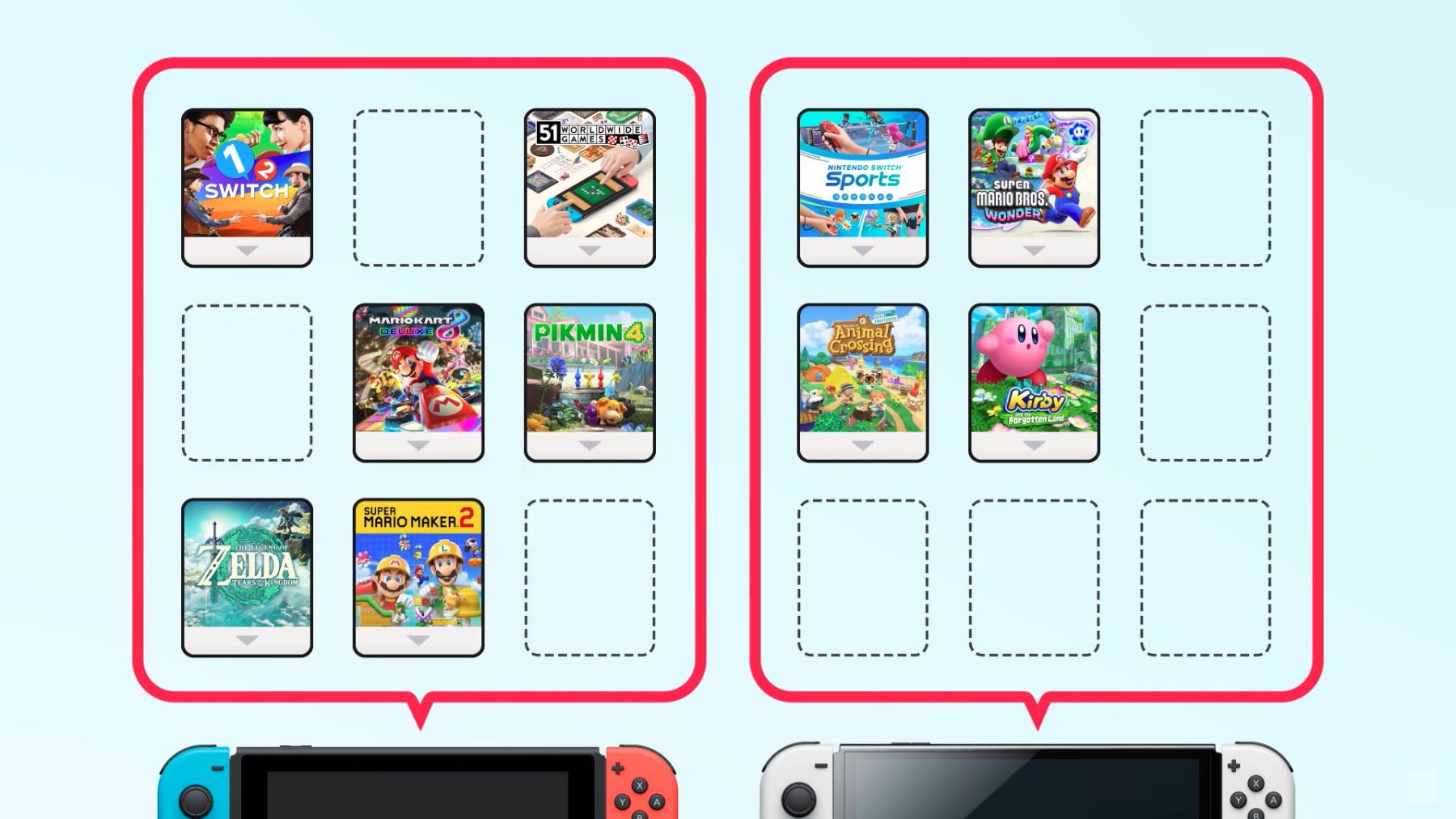Angezeigt werden vor allem aus dem eShop heruntergeladene Vollversionen von Switch- und Switch-2-Spielen. Eventuell nicht angezeigt werden in der Übersicht die kostenlosen Demo-Versionen von Spielen sowie Inhalte aus dem „Nintendo Switch Online“-Abonnement. Zudem werden Spiele, die exklusiv für die Nintendo Switch 2 erscheinen, wahrscheinlich nicht auf der Nintendo Switch angezeigt.