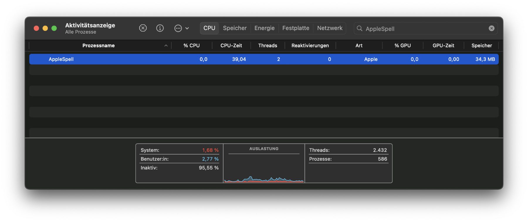 Als alteingesessener Standard-Prozess von macOS am Apple Mac sollte AppleSpell eigentlich keine Probleme machen. In seltenen Fällen kann es aber schonmal dazu kommen, dass das System oder der Textabgleich mit dem internen Wörterbuch einen Schluckauf hat. Dann könnt ihr den Prozess über die Aktivitätsanzeige beenden oder einfach euer Dokument speichern sowie den Mac neustarten (ausmachen und wieder einschalten). Ist das gerade nicht möglich, dann könnt ihr versuchsweise die Autokorrektur ausschalten, um AppleSpell-Probleme zu lösen.
