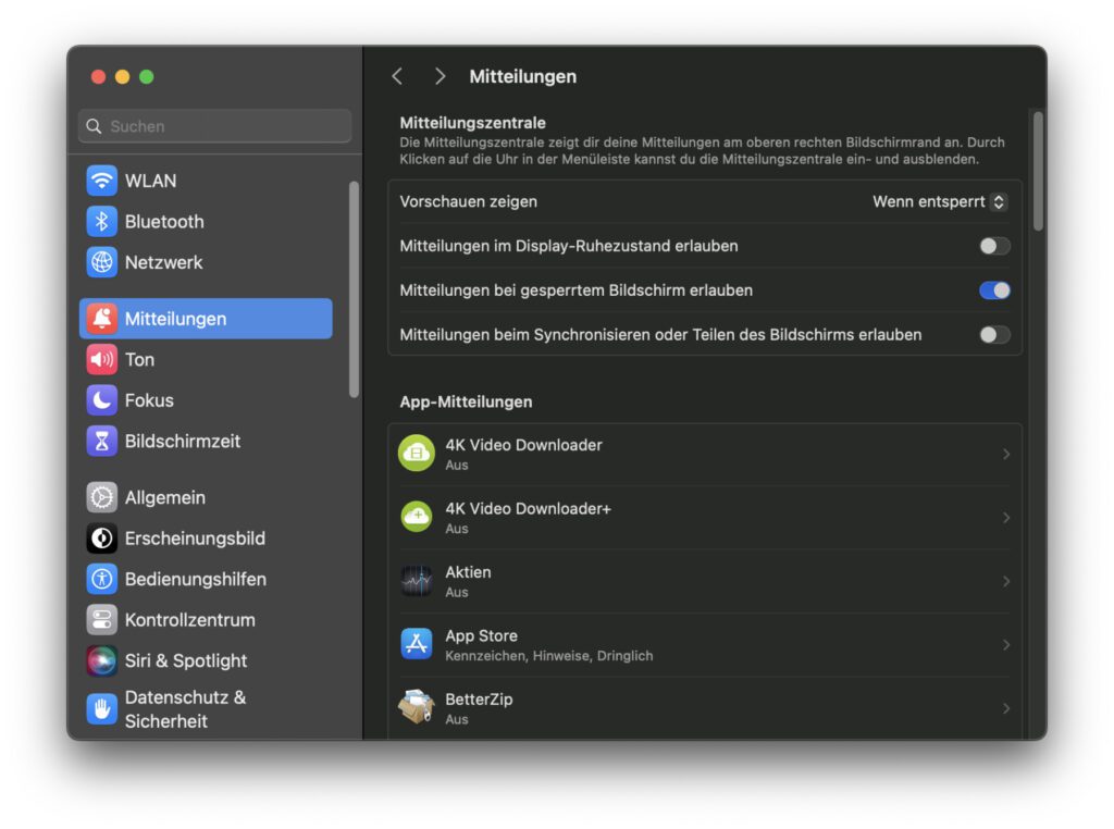 Wenn ihr bestimmte Mitteilungen unter macOS aktivieren, deaktivieren oder anderweitig verwalten wollt, dann habt ihr dafür verschiedene Optionen. So könnt ihr beispielsweise in den Systemeinstellungen (Apple-Symbol -> Systemeinstellungen… -> Mitteilungen) festlegen, welche Apps und Dienste euch Push Notifications senden dürfen. Außerdem könnt ihr dort einstellen, ob die Inhalte der Benachrichtigungen schon auf dem Sperrbildschirm oder erst im entsperrten Zustand angezeigt werden dürfen. Mitteilungen können weiterhin auf mit anderen geteilten Bildschirmen ausgeschaltet werden.