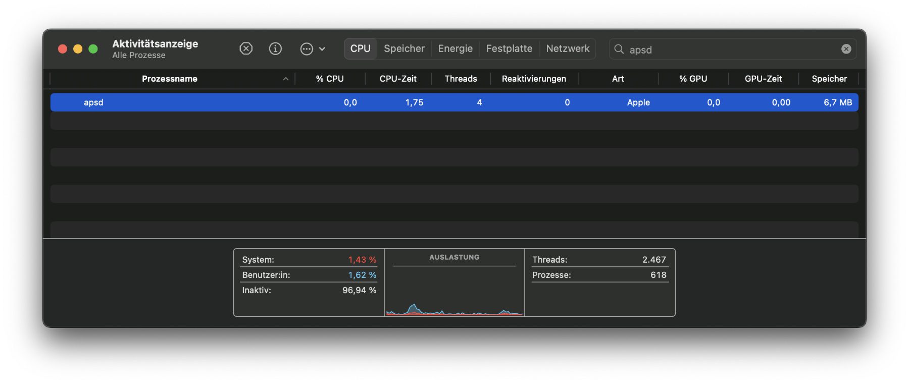 Wollt ihr nach dem Blick in die Aktivitätsanzeige wissen, was es mit dem dort gelisteten Hintergrundprozess apsd auf sich hat? Dann seid ihr hier an der richtigen Stelle. Denn in diesem Beitrag erkläre ich euch, wozu macOS am Apple Mac diesen Prozess benötigt und wie ihr manuell Einstellungen dafür vornehmen könnt. Die gute Nachricht zum Einstieg ist dabei: es handelt sich nicht um Schadsoftware, sondern um einen normalen Teil des Betriebssystems eures Apple-Computers, der schon seit vielen Jahren zum Einsatz kommt.