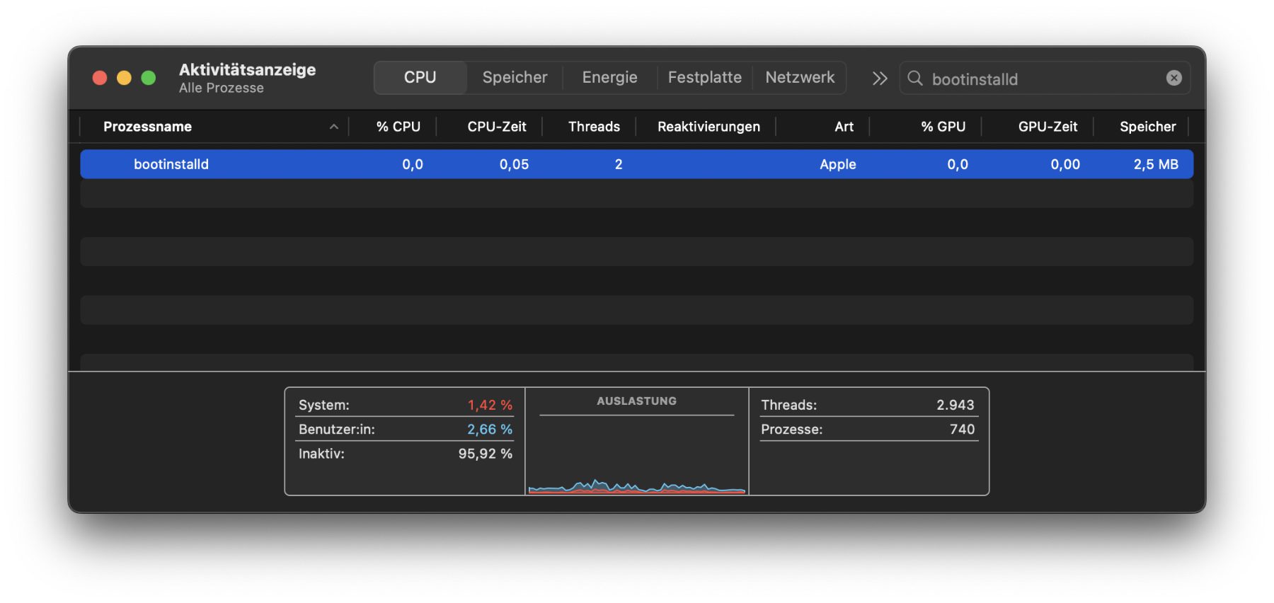 Falls bootinstalld 100% CPU verbraucht oder den Arbeitsspeicher auslastet, dann sollte er über die Aktivitätsanzeige beendet werden. Daemons werden meist automatisch neu gestartet, weshalb nach dem Beenden dieser Prozesse kein weiteres Eingreifen notwendig werden sollte. Lassen sich die hohe CPU- bzw. RAM-Last nicht über das Beenden des Prozesses lösen, sollte man den Mac neustarten – also komplett ausschalten, kurz warten und ihn dann wieder einschalten.