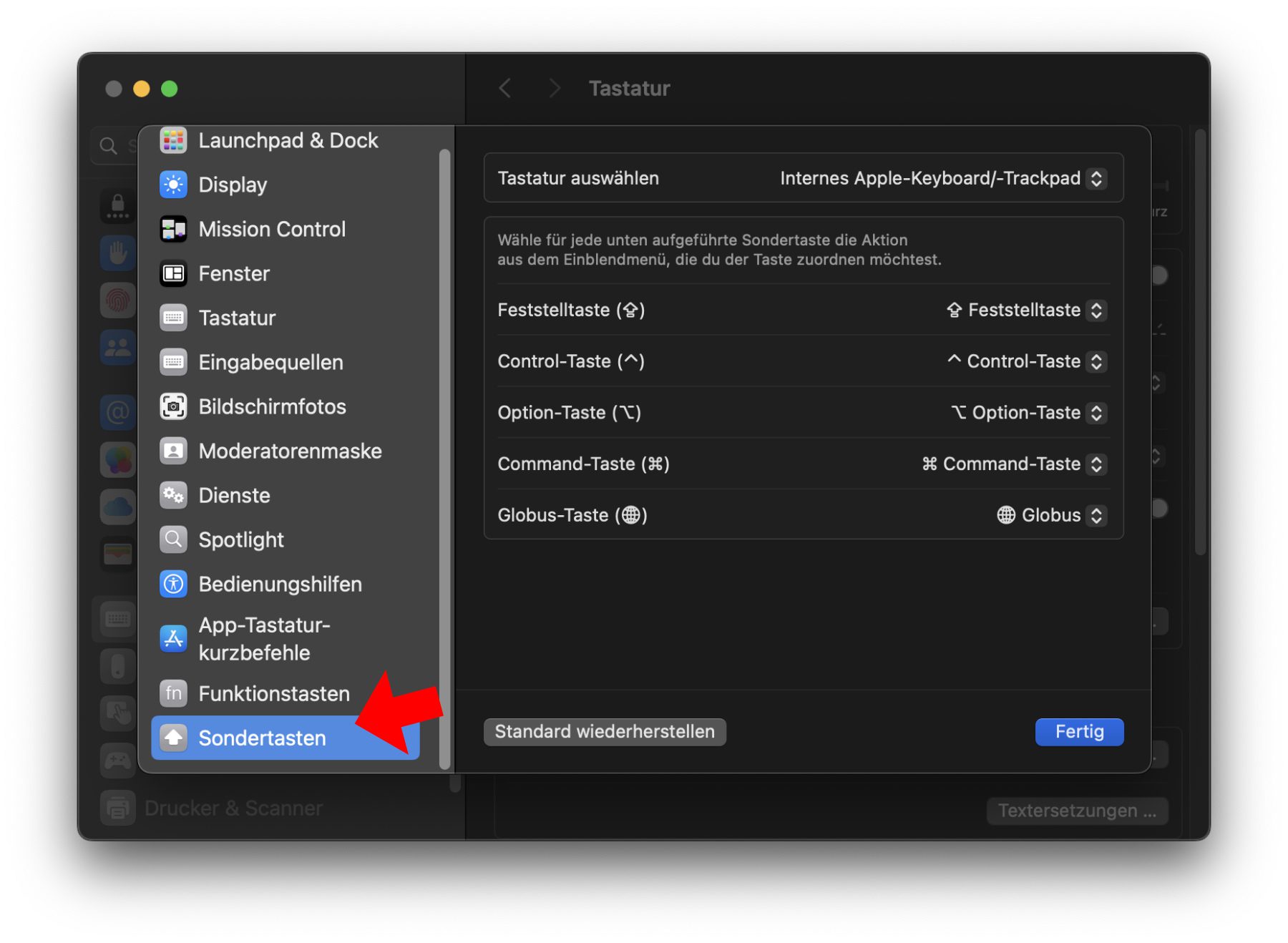 - Links den Listenpunkt Sondertasten (ganz unten) wählen