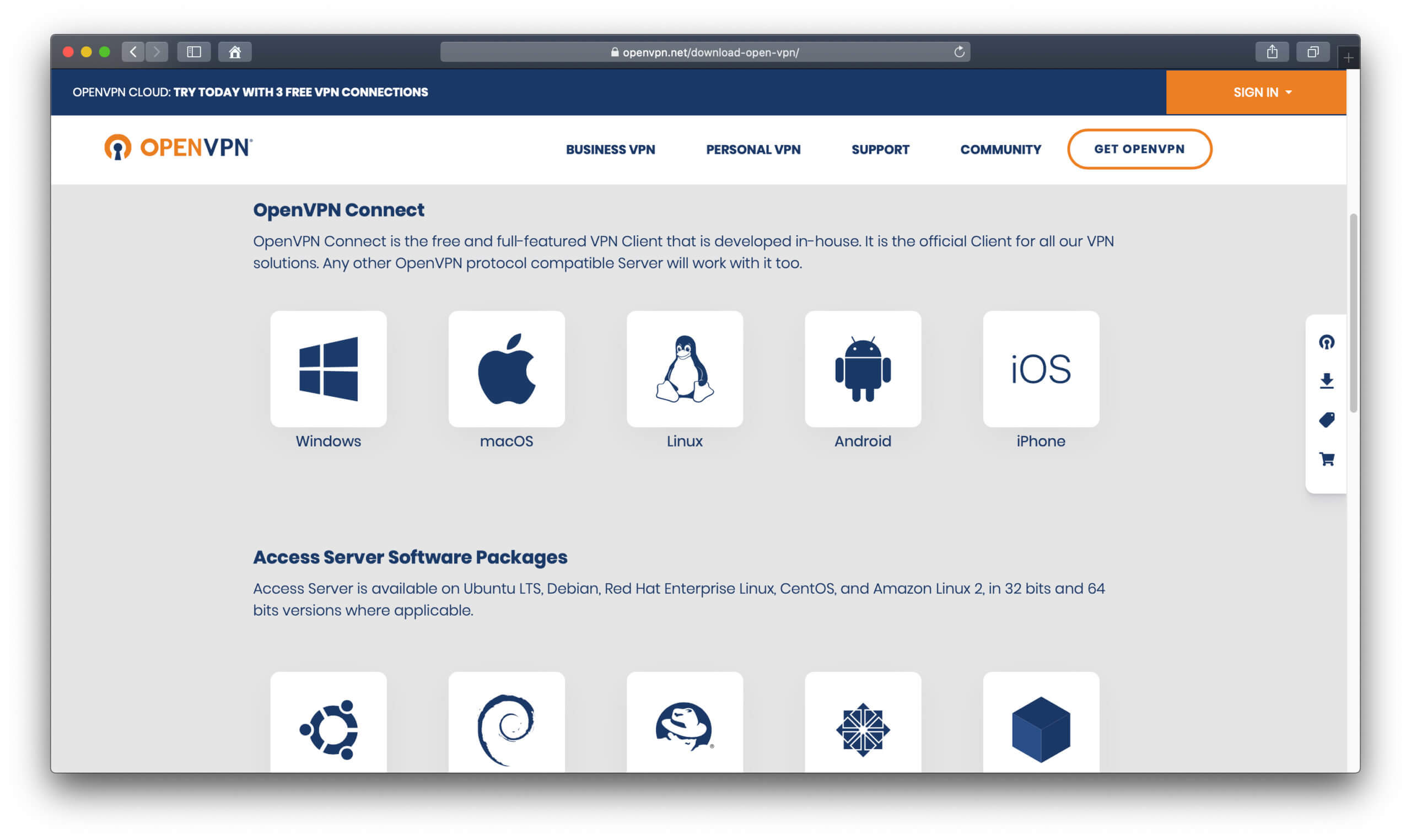 Die offizielle Webseite für detaillierte Informationen und den OpenVPN Download ist https://openvpn.net. Dort findet ihr ganz oben die Auswahl von Lösungen für private Anwender/innen sowie für den Business-Bedarf. Komplette Lösungen sind nur innerhalb eines kurzen Testzeitraums kostenlos. Für Private kosten sie je nach gebuchtem Paket $6 pro Monat oder $36 pro Jahr; fürs Business gibt es sowohl kostenlose Angebote (2 VPN-Verbindungen) als auch Preise bis über 1.500 Dollar (bei 1.000 Verbindungen). Die komplett kostenlosen Versionen für macOS, Windows, iOS, Android, Linux und Co. werden im Menü unter „Get OpenVPN“ für Test-Zwecke angeboten: https://openvpn.net/download-open-vpn/.