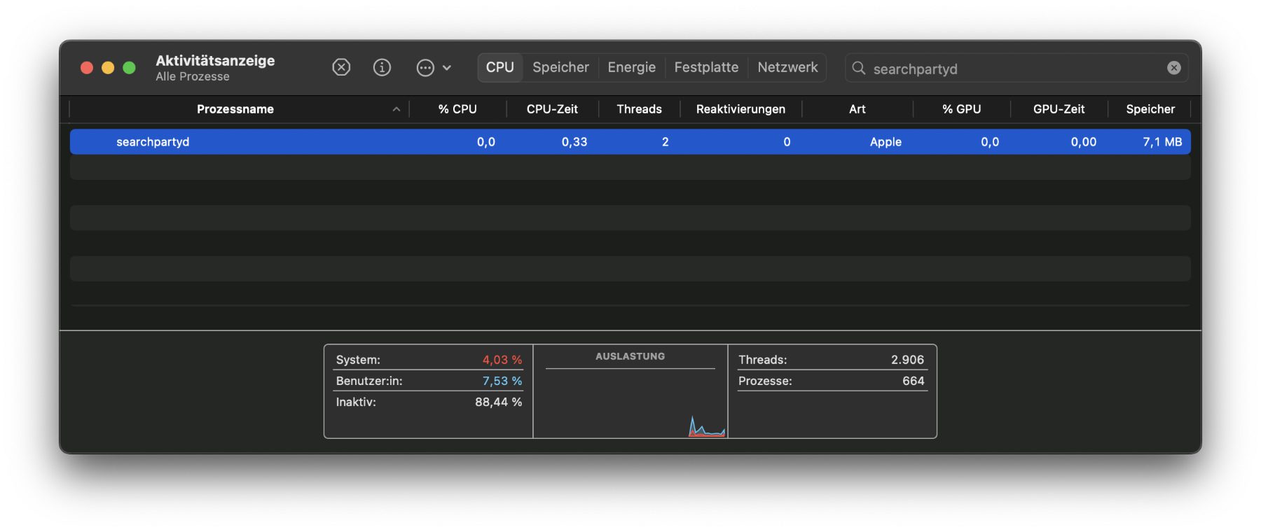 Das ergibt sich schon allein aus dem Namen des Prozesses: Search Party Daemon. „Search Party“ lässt sich mit Suchkommando oder Suchtrupp übersetzen. Ein Daemon ist ein vom Mac automatisch ausgeführter Prozess, der selbstständig bestimmte Aufgaben übernimmt, um die Mensch-Maschine-Kommunikation zu vereinfachen.