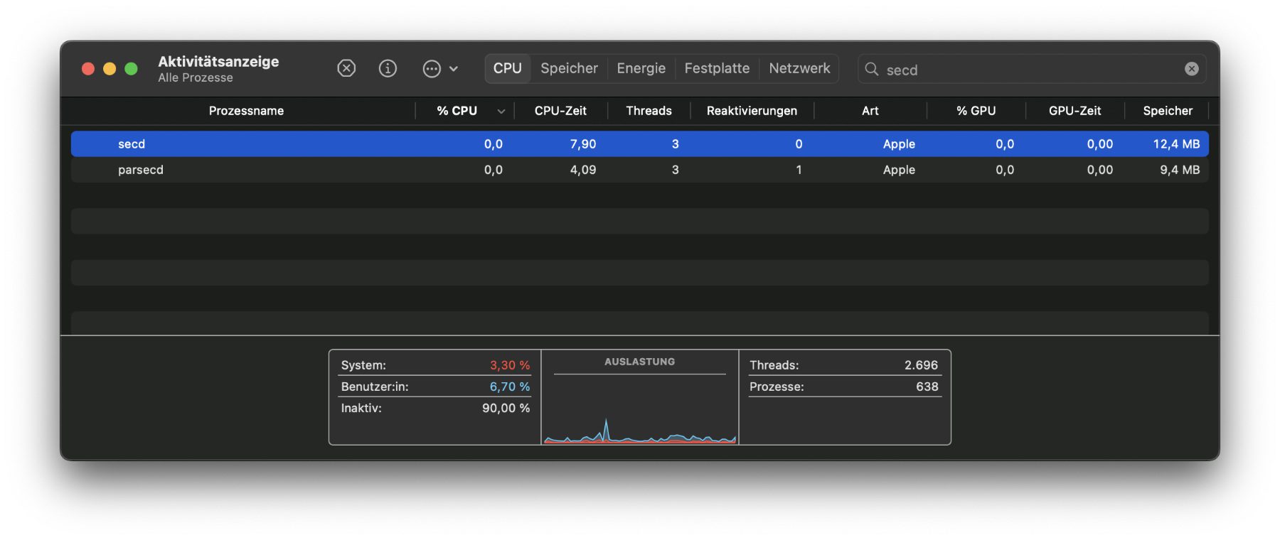Eigentlich sollte secd keine Probleme machen. Aufgrund eines Bugs kann es aber im Mac-Betrieb, und vor allem nach einem fehlerhaften Update des Betriebssystems, zu einer hohen CPU- und / oder RAM-Last kommen. Wie oben schon erwähnt, könnt ihr den Prozess dann über die Aktivitätsanzeige beenden, sodass er neugestartet wird. Das ist aber kein Garant dafür, dass er anschließend wieder fehlerfrei läuft.