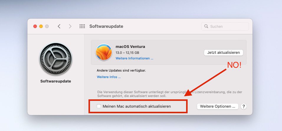 Wie man am aktuellen Fall vom macOS Ventura Update sieht, ist bei größeren Aktualisierungen des Betriebssystems immer besondere Vorsicht geboten. Hier empfehle ich immer ein Backup zu machen, auf das man im schlimmsten Fall zurückgreifen kann.