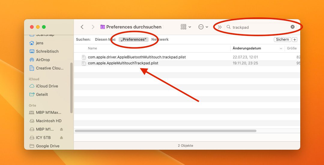 Hier ein anderes Beispiel: Euer Mac reagiert plötzlich komisch bei der Verwendung des Trackpads? Dann könnt ihr dies eventuell lösen, indem ihr die entsprechenden plist-Dateien findet und löscht. Das kann aber ein bisschen trickreich sein, denn mit der normalen Finder-Suche spuckt das System die plist-Dateien nicht aus. Daher muss man überlegen, wo sie stecken könnten.
