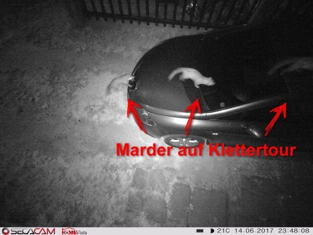 Sowohl am Tag macht die SecaCam HomeVista Fotos als auch mit ihren unsichtbarem Licht bei Nacht. Die Nachtaufnahmen sind durchaus vorzeigbar. Wenn die Tiere (oder Menschen) sich nicht zu schnell bewegen, dann erkennt man auch reichlich Details. Bei flinken Bewegungen können Nachtaufnahmen aber auch verschwommen sein. Wollt ihr also speziell Marder, Mäuse oder gar Fledermäuse aufnehmen, dann nutzt besser die Video-Funktion.