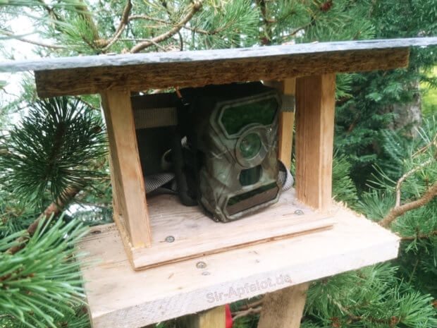 Im Grunde hält die SecaCam HomeVista Wildkamera auch Wind und Wetter aus. Im Test hat sie auch heftigere Schauer mit ordentlich Wind sowie Kälte genauso wie sehr warme Temperaturen abgehalten. Wollt ihr sie aber so neuwertig wie möglich halten, dann könnt ihr sie auch überdacht zum Einsatz kommen lassen. Wie auf dem Bild zu sehen passt das handliche Gerät in ein Vogelhaus. Habt ihr einmal den Dreh raus, dann gehen Montage und Demontage ganz schnell.