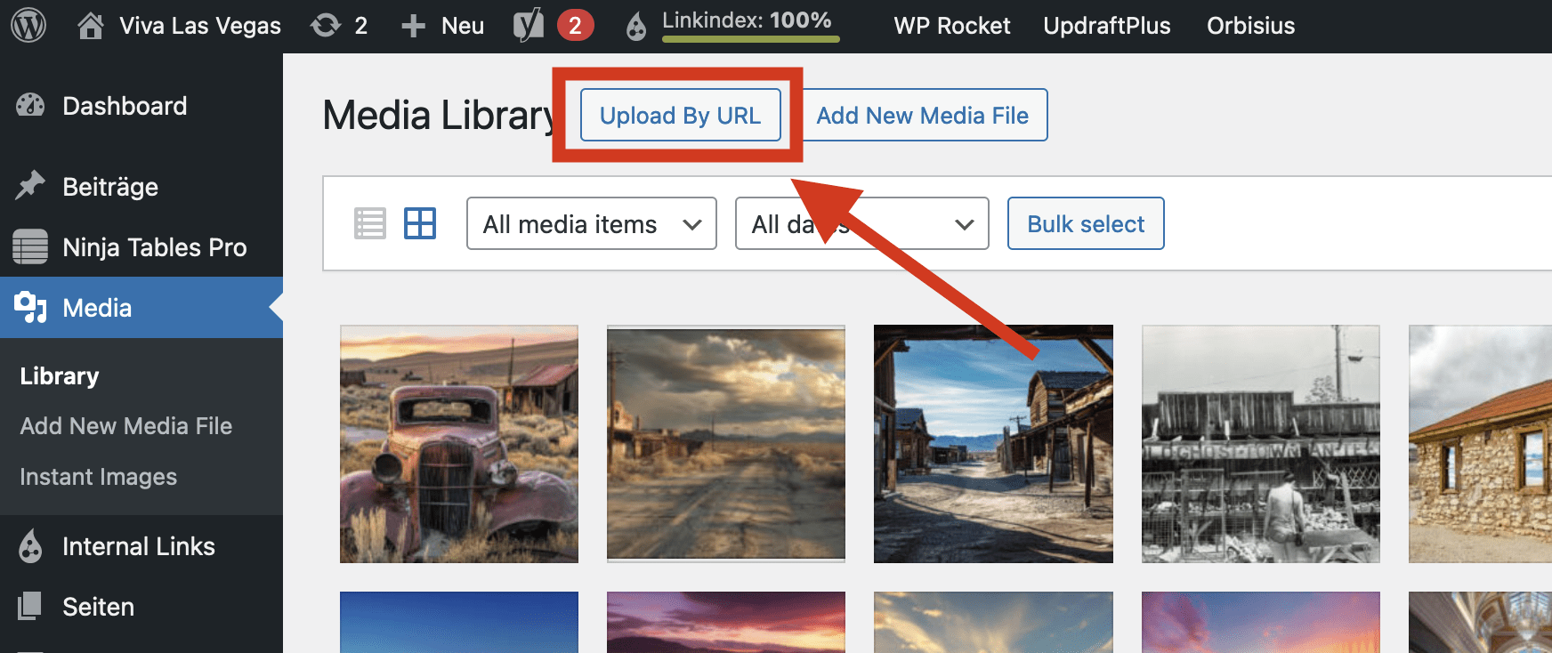 Wenn man nicht in einem Beitrag arbeitet, sondern direkt in der Mediathek ein Bild per URL hochladen möchte, findet man den Button „Upload by URL“ oben neben der Überschrift „Media Library“.