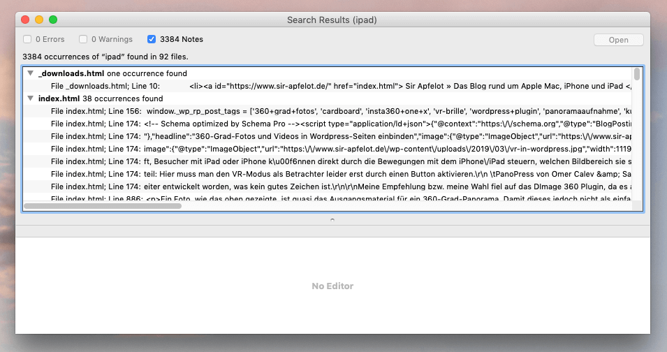 Ist SiteSucker durch, hat man einen Ordner mit den ganzen HTML-Dateien, in denen sich das entsprechende "böse Wort" verstecken könnte. Diese habe ich mit der Multi-File-Suchfunktion von BBEdit durchsucht, denn dieser öffnet die Dateien und sucht im Quelltext nach dem Wort.