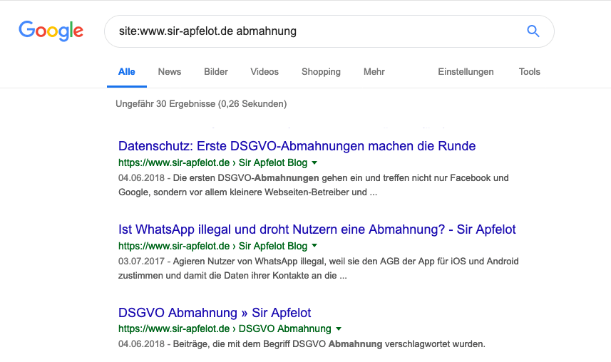 Die Google-Suche mit der Suchanfrage ala "site:www.sir-apfelot.de böses Wort" ist leider auch keine Hilfe, da diese nur archivierte Daten auswirft, die einige Tage alt sind. Und es gibt keine Art der Suche auf Google, die sicherstellt, dass man bei den Änderungen auf der Webseite nichts übersehen hat. Dafür müsste man warten, bis der Google-Bot alle Seiten neu indexiert hat und dann wieder suchen.