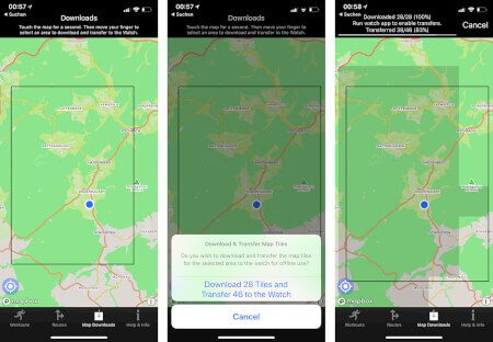 Ein grosses Plus ist meiner Ansicht nach die Möglichkeit, Kartenmaterial auch offline zu nutzen. Dazu markiert man in der App am iPhone den entsprechenden Kartenausschnitt(siehe Screenshots unten) und dieser wird dann von der iPhone-App an die Apple Watch geschickt. Hat man keine LTE-Apple-Watch, kann man so trotzdem unterwegs das Kartenmaterial nutzen, wenn das iPhone zuhause liegt. Ich habe mir direkt die nähere Umgebung auf der Watch gesichert, was etwa eine Minute gedauert hat. Wieviel Quadratkilometer Fläche man auf seiner Watch unterbringen kann, habe ich noch nicht ausprobiert, aber gut 100 qkm sind bei mir sicher schon zusammen gekommen.