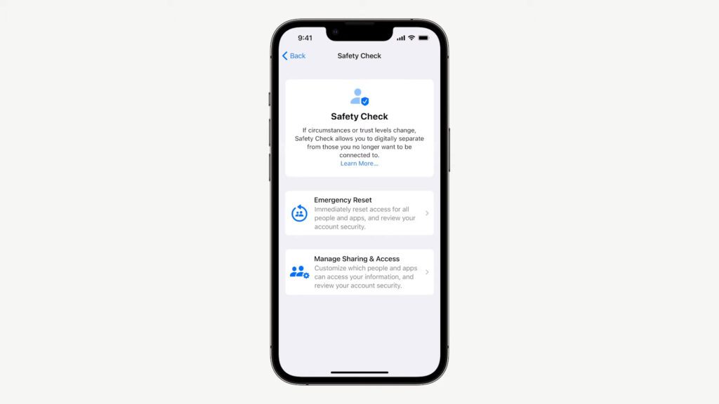 Der Safety Check dient z. B. unter iOS 16 dazu, das Teilen des Standorts, von App- und Webseiten-Zugängen sowie weiterer Daten zu überprüfen und ggf. zurückzusetzen. Im Rahmen der WWDC22 Keynote wurde dieses Feature auch und vor allem für Opfer von missbräuchlichen Beziehungen vorgestellt. Mit Safety Check kann auf einen Blick festgestellt werden, wer Daten erhält bzw. Zugriff darauf hat. Schnell können gewalttätige Personen aus der Liste entfernt werden, sodass man sich ohne Angst davor, verfolgt zu werden, in Sicherheit bringen kann. Mit dem „Emergency Reset“ kann man alle Freigaben schnell und einfach zurücksetzen, um nicht in allen Einstellungen suchen zu müssen. Mehr zum Thema: Was ist Stalkerware?