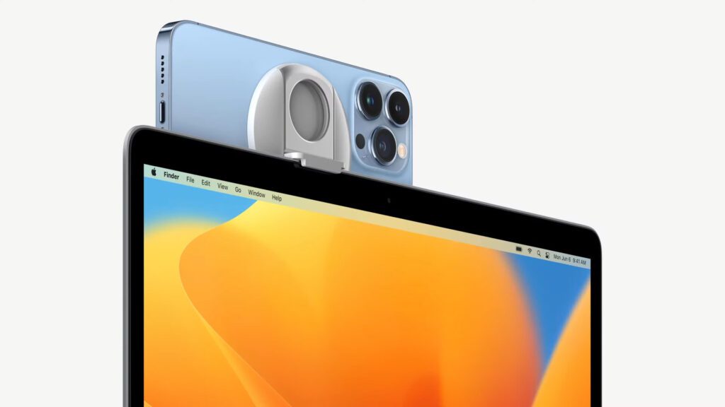 Es gibt mehrere Apps, mit denen man jetzt schon das iPhone als Webcam am Mac oder PC verwenden kann (DroidCam / EpocCam). Vermittels Continuity Camera wird es nun aber möglich, das iPhone mit bordeigenen Mitteln am Mac als Webcam zu verwenden. Dabei spielt aber nicht nur eines der zwei bis drei Objektive auf der Rückseite des Smartphones eine Rolle. Neben dem Übertragen des Gesichts (inklusive Center Stage) ist auch das Übertragen der Arbeitsfläche / Tastatur möglich. Dafür wird die Ultraweitwinkel-Kamera genutzt. Entsprechende Halterungen für das MacBook, den iMac oder Monitore sollen bald von Belkin angeboten werden.