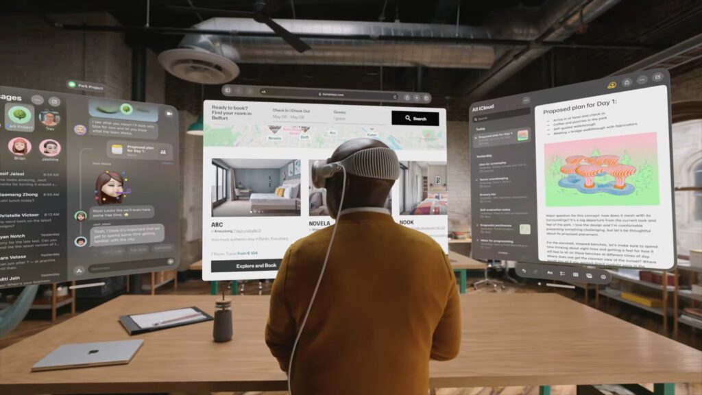 App-Fenster, Videos, Fotos und dergleichen lassen sich in der Größe und der Position im Raum anpassen. Für die ablenkungsfreie Nutzung lassen sich virtuelle Umgebungen (Natur, Kino, etc.) verwenden. Sich nähernde Personen werden aber angezeigt und sie sehen die Augen der Nutzenden – dafür werden sie per EyeSight genannter Technologie auf einem gebogenen OLED-Display angezeigt. Die Front des Geräts besteht dafür aus einem 3D-geformten Glasteil. Die Augen-Anzeige kann aber auch ausgeblendet werden, um anzuzeigen, dass man gerade beschäftigt ist. Will man sich virtuell präsentieren, etwa für FaceTime, kann man vorher das Gesicht scannen. Das sieht tausendmal besser aus als der Metaverse-Quatsch von Meta / Facebook.