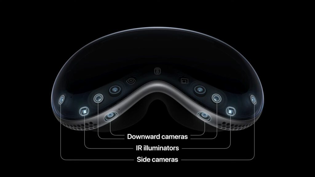 Unter dem 3D-geformten Glas, das in ein Aluminium-Gehäuse übergeht, sitzt nicht nur das gebogene OLED-Display, sondern auch mehrere Kameras und Sensoren. Am Gehäuse gibt es Tasten und eine Digital Crown. Die jeweils dreiteiligen Linsen lassen sich auf der x-Achse verschieben, um mit verschiedenen Augenabständen verwendet zu werden. Brillenträger/innen müssen sich extra Zeiss-Linsen anfertigen lassen, die magnetisch verbunden werden. Es kommen microOLED-Bildschirme zum Einsatz, die auf dem Raum eines iPhone-Pixels ganze 64 Pixel bieten. So soll ein klares Bild ohne „Fliegengitter-Effekt“ ermöglicht werden. Insgesamt sollen für das Headset 5.000 Patente angemeldet worden sein.