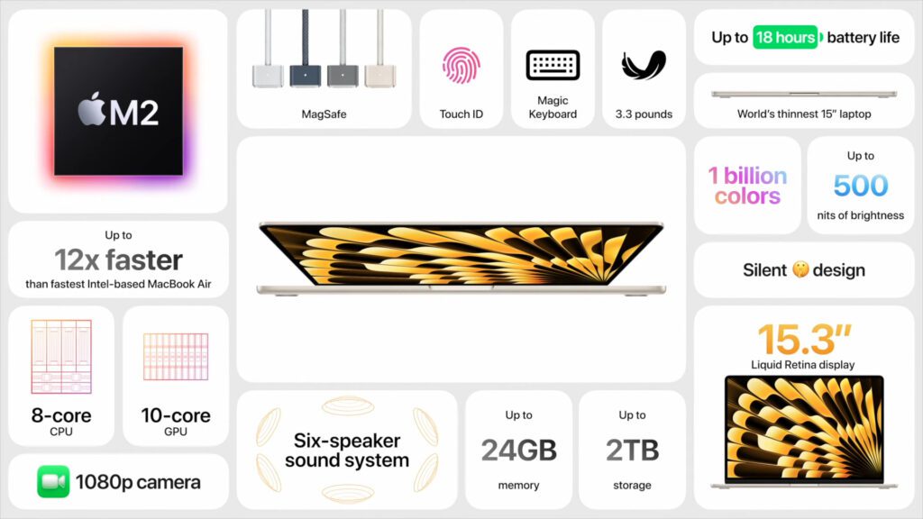Wie schon in vielen Gerüchten seit Monaten angekündigt, so gibt es nun ein MacBook Air, das ein 15-Zoll-Display bietet. Dank M2 Chip soll es der leistungsstärkste 15-Zoll-Laptop am Markt sein. Kein Wunder, denn das MacBook Pro gibt es ja nur noch in 14 Zoll oder 16 Zoll. Das Gerät kommt in vier Farben daher, misst zusammengeklappt nur 1,15 cm in der Höhe und wiegt lediglich 1,51 kg. Es sind bis zu 2 TB Speicher und 24 GB Arbeitsspeicher konfigurierbar. Preislich starten wir hier bei 1.599 Euro; die beste Ausstattung lässt den Preis auf 2.979 Euro ansteigen. Ihr könnt das Gerät ab heute vorbestellen, es ist dann ab kommender Woche erhältlich.