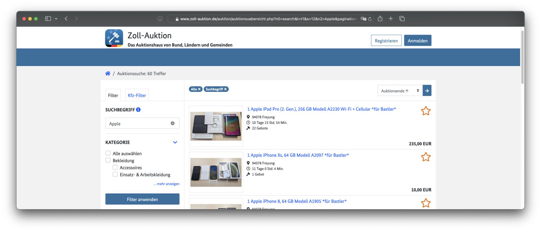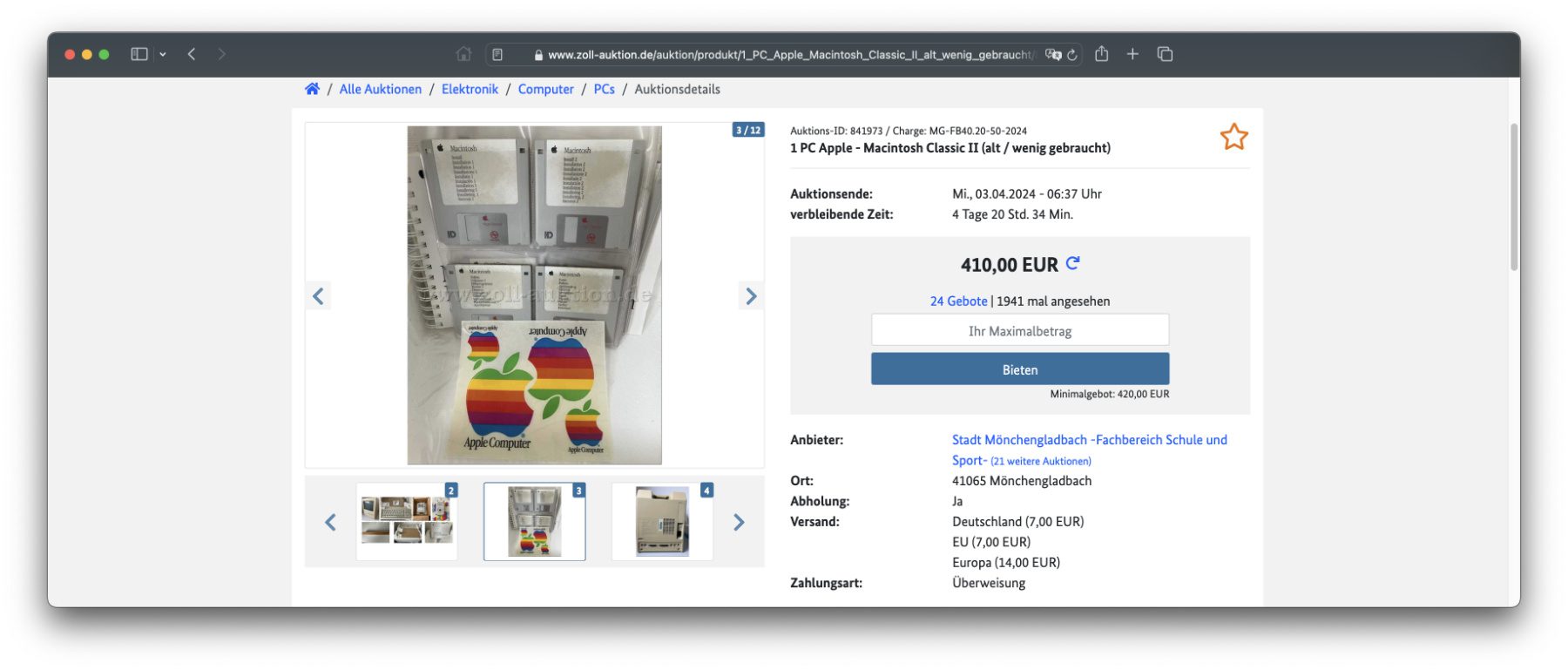 Wusstet ihr, dass es ein offizielles Online-Auktionshaus von Bund, Ländern und Gemeinden gibt? Auf der Webseite Zoll-Auktion.de gibt es gepfändete, sichergestellte, beschlagnahmte und gefundene Sachen, die nach der jeweiligen Wartefrist in das Eigentum der Anbietenden übergegangen sind. Mit dem Suchbegriff „Apple“ findet man auf der Plattform derzeit u. a. ein Paket aus fünf iPhones verschiedener Jahrgänge, die von der Stadt Frankfurt am Main versteigert werden. Aber auch ein Macintosh Classic II inklusive Verpackung, Anleitung, Zubehör, Software-Disketten und bunten Stickern wird angeboten – von der Stadt Mönchengladbach. Weitere Details findet ihr in diesem Beitrag.